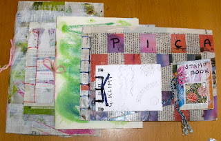 I started off by making four Folded Stitch Books, with different themes. One was pages of lettering, another painted and woven sheets, a third left over printed words in different fonts and lastly one that was really rather too small, and I used for just putting a stamp on each page. Sometimes when they come in the post, they are too interesting/pretty to throw away. This last one needed a lot of clamping to make it stay shut so 8 pages is probably maximum for that size.